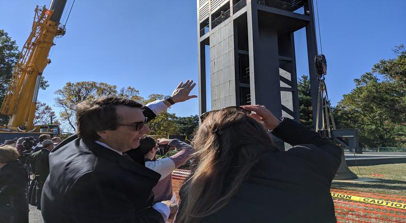 During Monday’s ceremony, Charles Cuvelier, National Parks Service superintendent of the George Washington Memorial Parkway, and Ambassador Haspels spoke of the friendship between the United States and the Netherlands symbolized by the carillon. As workers used a crane to remove bells from the carillon tower behind them, the two men rang small hand bells to signify the last bells that will ring at the site while the renovation proceeds. The Park Service recorded a video of the second-largest bell being lowered from the carillon Oct. 21.