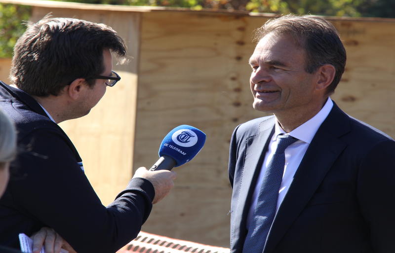 The photo below shows Ambassador Haspels being interviewed after the event by De Telegraaf reporter Jan Postma. The wooden structure in the background encloses one of the two royal lions that mark the entrance to the Netherlands Carillon plaza. The bronze lions, designed by Dutch sculptor Paul Koning, are being protected during the restoration project.
