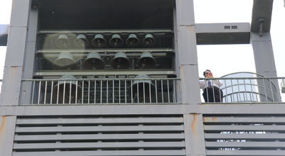 A close-up of one of the Netherlands Carillon’s bells, showing the wires attached to the strikers.