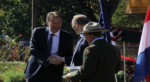 Also speaking at the restoration event Monday was Diederik Oostdijk, professor of English literature at Vrije Universiteit Amsterdam, who serves on the Netherlands Carillon Advisory Committee that helped plan the restoration and who just published a book describing the history and significance of the Netherlands Carillon. At the ceremony, Prof. Oostdijk presented copies of Bells for America: The Cold War, Modernism, and the Netherlands Carillon in Arlington to Ambassador Haspels and Superintendent Cuvelier. The book recounts the history of the Netherlands Carillon, how most Americans are unaware of the monument’s presence so close to other American monuments, how the carillon was allowed to rust into disrepair, and how plans for the carillon’s renewal took shape for 2020, which will mark the 75th anniversary of the Netherlands liberation during World War 2.