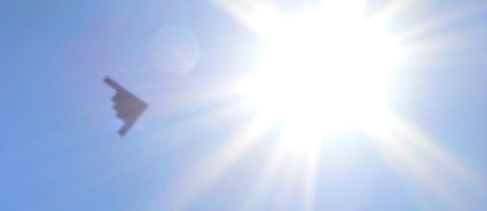 A B-2 Spirit bomber made an approach from the east. My wife caught this picture just as it flew into the sun.