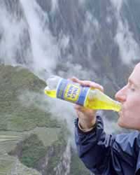 Drinking an Inca Kola while overlooking Machu Picchu. Inca Kola is very sweet and tastes a bit like bubblegum.