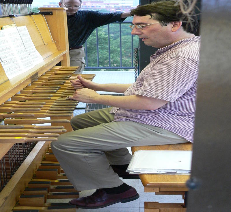 In these photos, Edward Nassor, the Park Service’s director-carillonneur for the Netherlands Carillon since 1987, points out to an attendee that the carillon contains a glass-enclosed structure at the top with a playing console that allows the carillonneur to play the 50 bells much like a piano keyboard. The following photo shows Nassor playing the Netherlands Carillon in 2007 when the tower was open to the public. The pegs on the keyboard are usually struck with the with a lightly fisted hand. The pegs are tied directly to wires that control the bells’ strikers.
