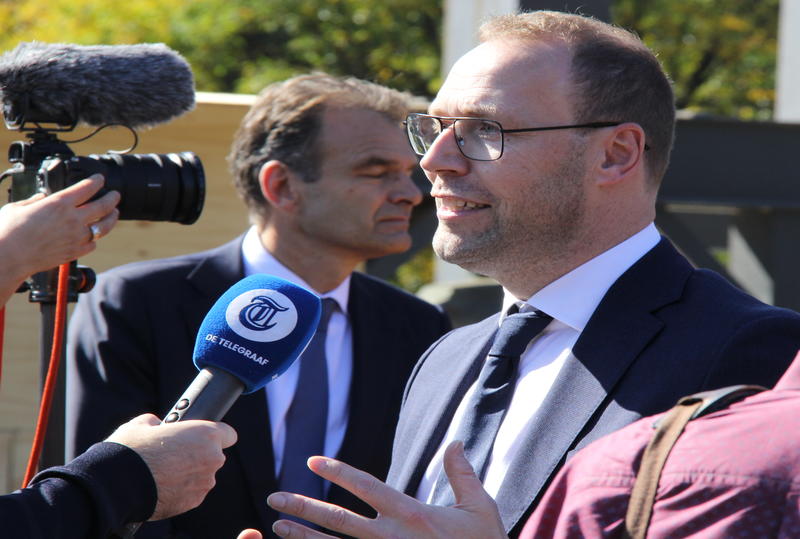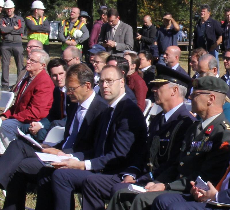 The photo below shows Ambassador Haspels being interviewed after the event by De Telegraaf reporter Jan Postma. The wooden structure in the background encloses one of the two royal lions that mark the entrance to the Netherlands Carillon plaza. The bronze lions, designed by Dutch sculptor Paul Koning, are being protected during the restoration project.