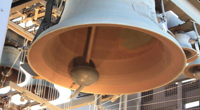 A close-up of one of the Netherlands Carillon’s bells, showing the wires attached to the strikers.