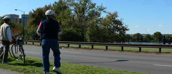 Bicyclists on the Mount Vernon Trail look toward the memorial in the distance.