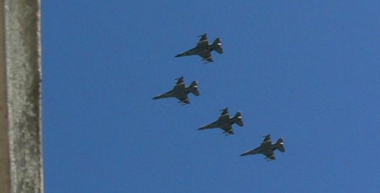 This photo from this morning shows the F-16 ‘missing man’ formation as it flew over our apartment.
